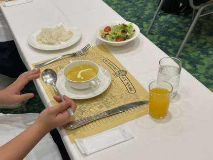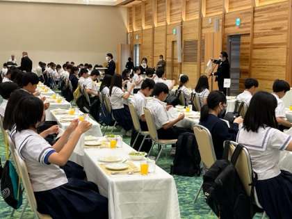 アイビースクエアで昼食です。テーブルマナーの説明を聞いて、美味しくいただきます。