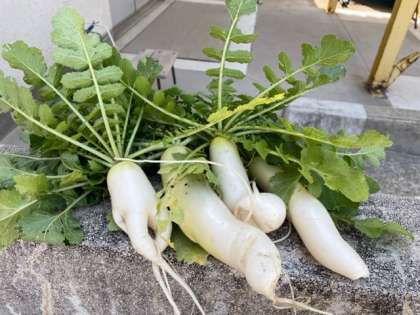 今日も元気な野菜の収穫ができました。大きな大根です。 暑さに負けず頑張りましょう。