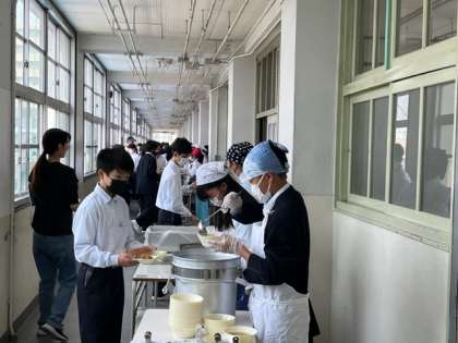 1年生の給食の様子です。給食当番が分担して配膳を行っています。