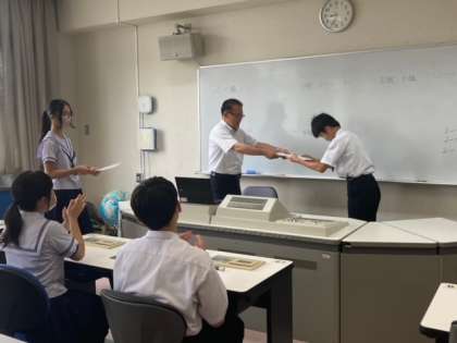 最初に、6/10・11の土日に行われた陸上部の大阪市春季総合体育大会の表彰がありました。女子はフィールド競技で「大阪市総合優勝」に輝きました。