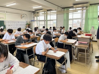 テストの様子です。集中して取り組んでいます。時間をうまく使い、見直しましょう。わからないところも最後まであきらめず、問題文をしっかり読んで解答しましょう。