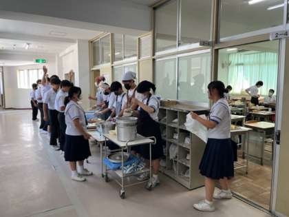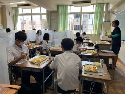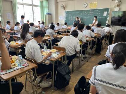 給食の時間です。ちょっと夏バテ気味の人もいるようですが、成長期の中学生は、モリモリ食べましょう。