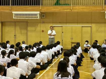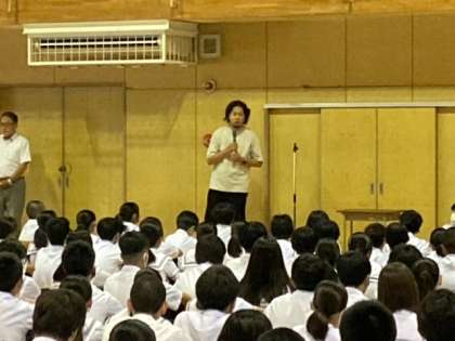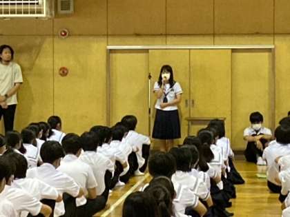 校長先生からは「学習について(丁寧に書く・繰り返しする・忘れる前に思い出す)」の話が、生徒指導主事の先生からは「視野を広げる」という話がありました。また、生徒会執行部からは昼休みに流す「曲の募集(CD)」がありました。