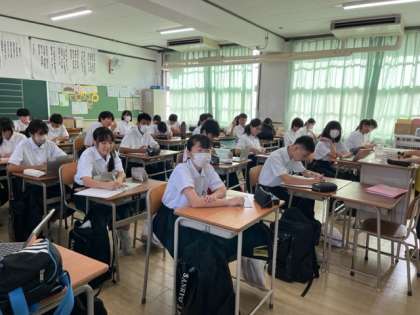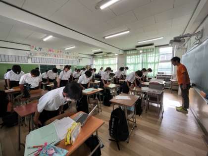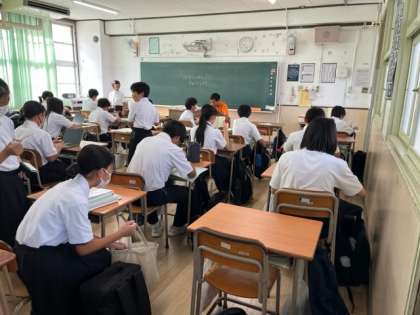 1年生の朝の学級の様子です。登校した生徒からタブレットパソコンを使い「心の天気」の入力、「朝の読書」が始まります。そのあと「朝の学活」の時間になります。時間に余裕を持って登校しましょう。