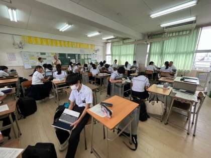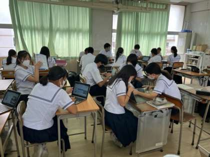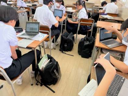 3年生「理科」の授業の様子です。先日行った実験の結果・考察をタブレットパソコンを使ってレポートにまとめています。相談したり意見交換をしたりしながら、わかりやすい発表ができるよう進めています。