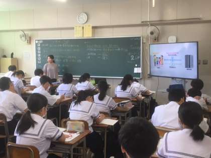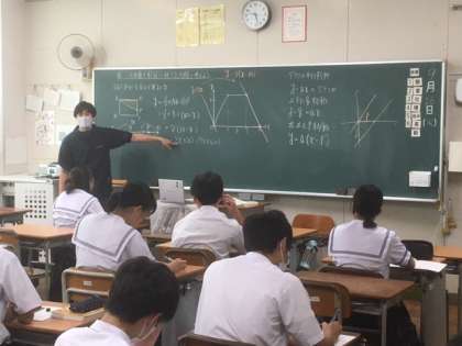 「数学」では一次関数の利用の問題に取り組んでいます。y=ax+bのグラフを図形の中にも応用させて考えます。