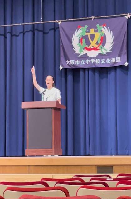 やたなか小中一貫校にて、第34回大阪市長杯英語暗唱大会がありました。本校から2年生1名が出場し、練習の成果を発揮してくれました。昨年度までの会場とは違い、大きな講堂での発表で緊張する生徒もいるなか、本番では堂々とした暗唱を見せてくれました。