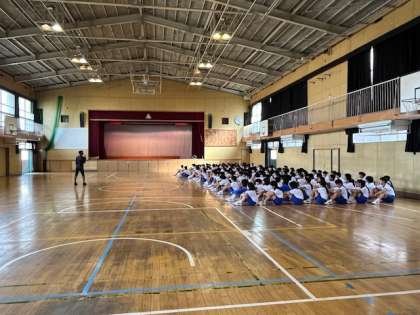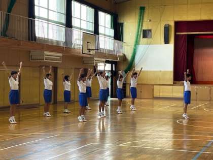 1年生、学年体育の授業です。10月27日(金)の運動会に向けて、学年練習の時間を摂っています。「三稜体操」を全体で揃えられるよう確認しています。