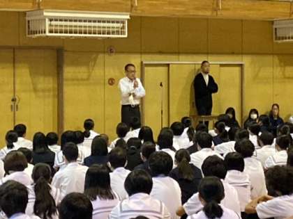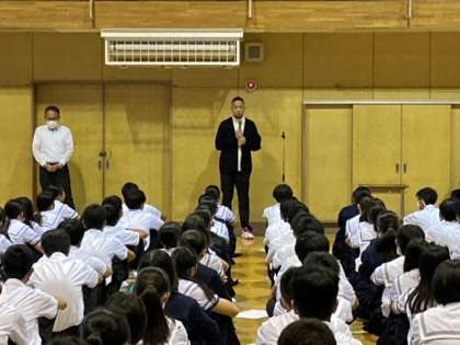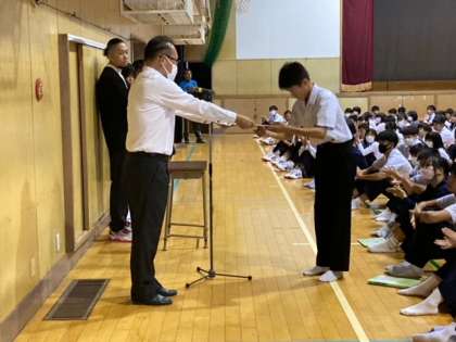 「おはようございます」元気な声で全校集会が始まります。陸上部が昨日出場した大阪市民陸上カーニバルでの賞状伝達がありました。3年生は駅伝に出場する生徒以外は、この大会で引退となります。