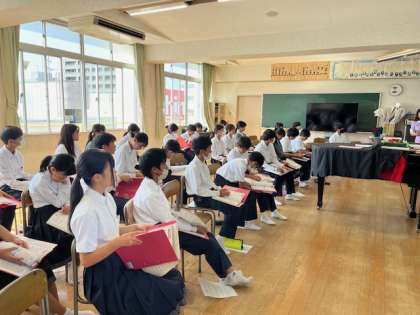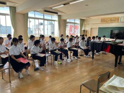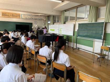 1年生「音楽」の授業の様子です。「強弱や曲想を意識し表現を工夫して歌う」ことを目標に学習をしています。音符について確認し、リズムをとっています。手拍子でのリズムはクラス全員揃っています。