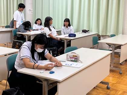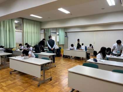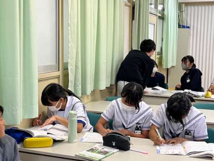 元気アップ地域本部主催の放課後学習会です。学習ボランティアの大学生にも来てもらっています。自学自習しながら、説明してほしい箇所やわからないところなどを聞きながら、進めています。