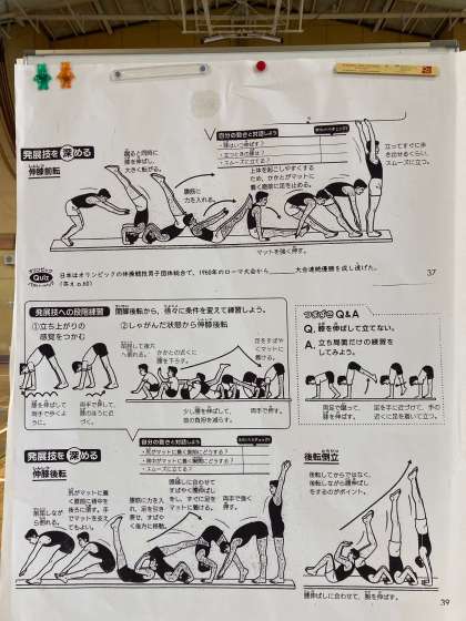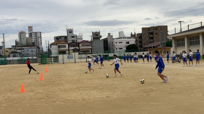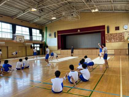 2限目、3年3、4組の授業は体育です。男子はマット運動、女子はサッカーです。男子は基本の動きを復習後、側転から1/4捻りという技の練習に取り組みました。女子はリフティング、ドリブルでリレーをすることによってボールの扱いになれることを目標にしています。