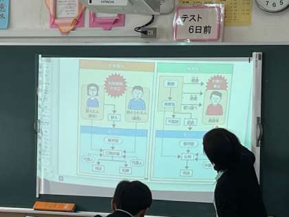 3年生「社会科」の授業の様子です。裁判の種類と人権について学習しています。民事裁判、刑事裁判の違いや人権保障について理解を深めました。3年生は期末テスト、実力テストも近づいてきました。家庭学習を計画的にしていきましょう。