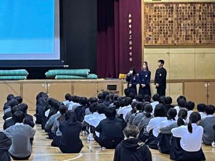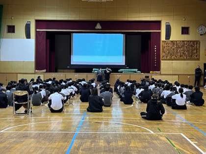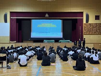 1年生の学年集会の様子です。学代会から「あいさつをしよう」「机の中など整理整頓をしよう」という呼びかけがありました。生徒会役員からは、スマホ・ネット依存についてのプレゼンを行いました。明日に行われる「スマホサミット」で第3教育ブロックの代表校として発表します。