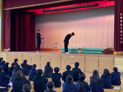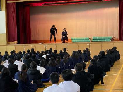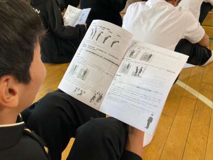 高校入試の面接対策を冊子を使って説明がありました。挨拶や質問に対する答え方など、礼儀・マナーを知り、各教室で練習、対策をしました。