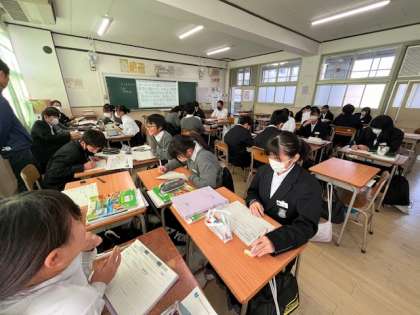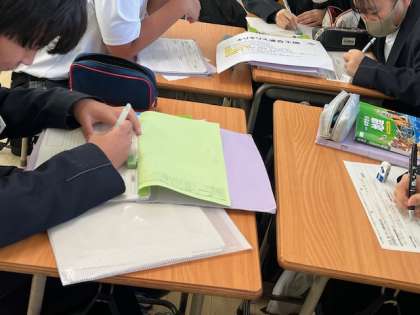 1年生「社会科」の授業の様子です。ヨーロッパに新しくつくられた架空の国のデータを読み取り、その国がEUに加盟した方がいいのか、加盟しない方がいいのかを考えています。意見交換をしながら考えを深めています。