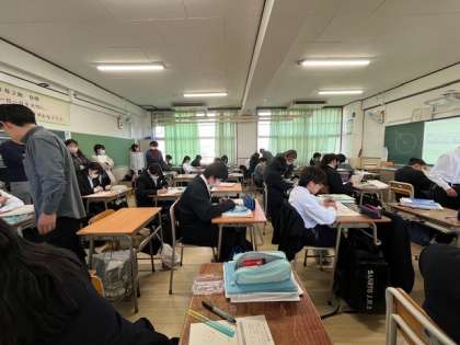 校区の小学校の先生による授業参観の様子です。小学校のときの担任の先生に、中学生として成長した姿を見てもらう機会にもなりました。