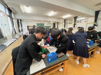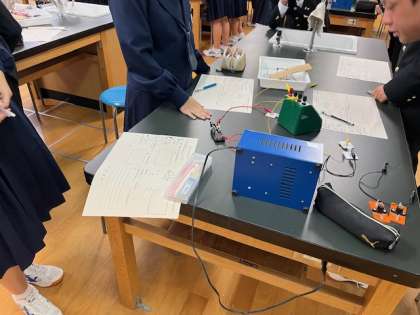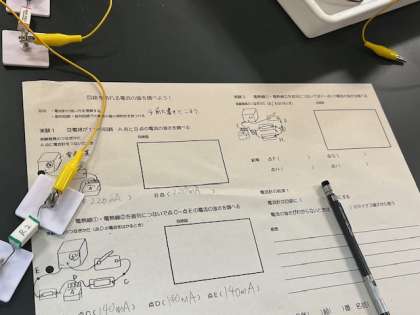 2年生「理科」の授業の様子です。回路に流れる電流の値を調べています。並列・直列での各点の電流の値を測定しています。