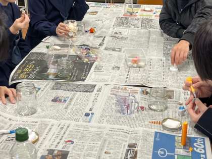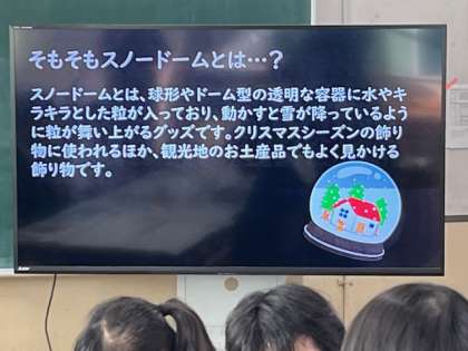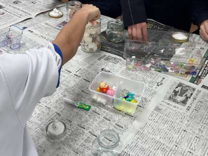 特別支援学級の授業の様子です。スノードームをつくっています。まわりの友達と確認しながら作業を行っています。また、手先を使って細かい作業をすることで集中する力を身につけます。
