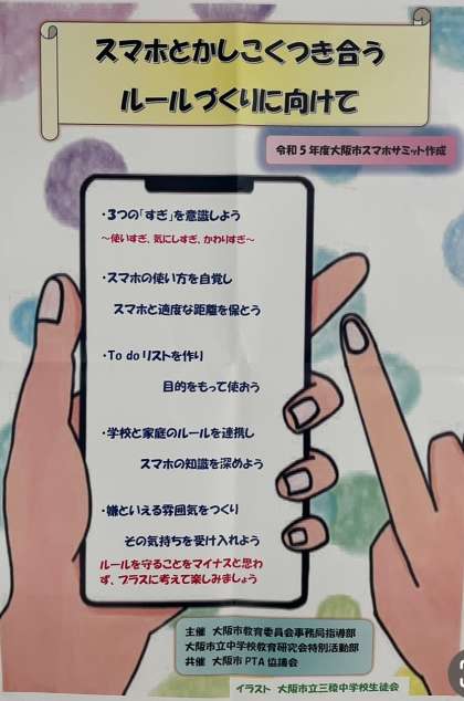 生徒会役員が参加したスマホサミットのポスターができました。「スマホと賢くつき合うルールづくり」について話し合った結果をまとめたものです。スマホ、ネット依存にならないよう考えましょう。なお、ポスターのイラストは三稜中学校生徒会役員が担当しました。