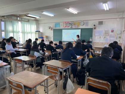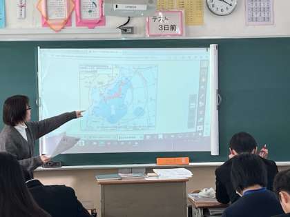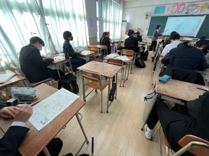 3年生社会科の授業です。入学試験前になり、問題演習も行っています。間違えたところは繰り返しやり直し、確実に解答できるようにしましょう。入学試験では、易しい問題でのミスを少なくすることが大切です。