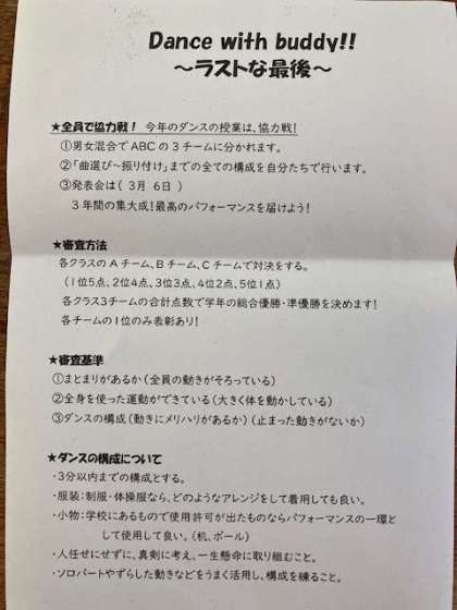 3年3・4組の2限目は保健体育です。中学最後のまとめとして、クラス対抗でダンス発表会をします。