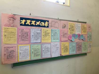 文化委員が「オススメの本」を紹介しています。朝の読書の時間や図書館の開館時間などを利用して読書を楽しんでみましょう。また、学級文庫もあります。職員室前には新聞も置いてあります。日ごろから活字に親しみ、読解力の向上につなげましょう。