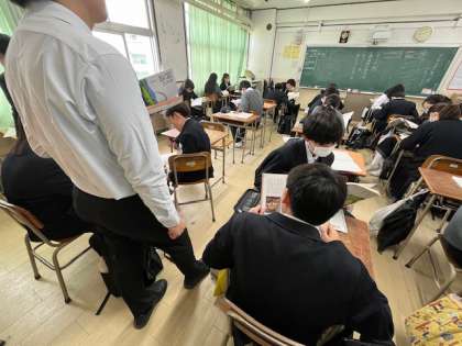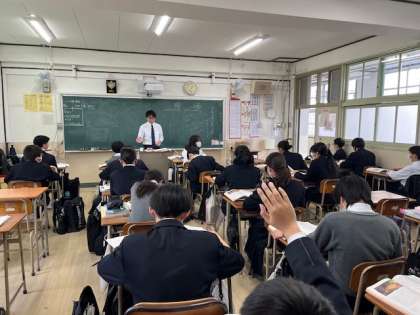 1年生「国語」の授業です。ヘルマン・ヘッセの「少年の日の思い出」を読んでいます。「僕」と「エーミール」の人物像を中心に読み取っています。
