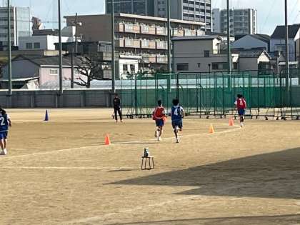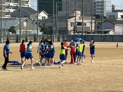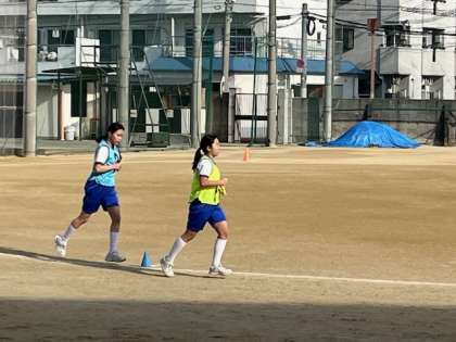 2年生女子体育の授業です。駅伝方式で中距離をリレーして走ります。「頑張れ!ファイト1」と声援を受け、自己ベストを更新しています。