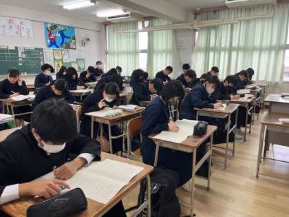 3年生「理科」の授業です。問題演習を行っています。入試問題は、問題文が長くなっています。長い文は細かく区切って読む(読点、ごとに)、重要なところはアンダーラインを引いたり、チェックを入れたりするなど工夫することも有効です。