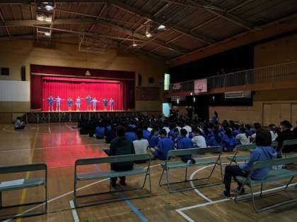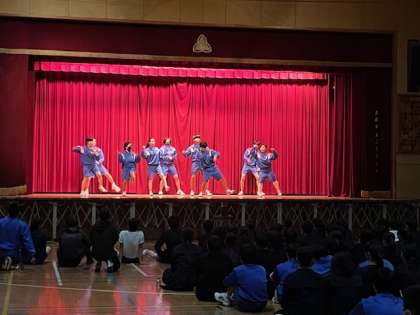 3年生「体育」の授業です。それぞれチームをつくり、ダンスの発表です。体育では、男女ともダンスは必修となっています。リズムの特徴をとらえ、変化のある動きを組み合わせリズムに乗って体幹部を中心に全身で自由に弾んで踊ることができることをねらいとしています。どのチームも工夫し表現力を高めていました。