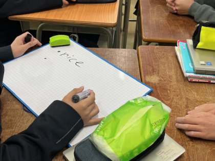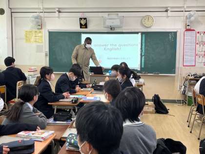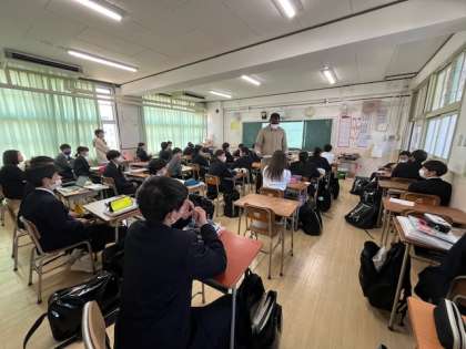 1年生「英語」の授業です。C-NET(osaka City-Native English Teacher)によるオールイングリッシュの英語の授業です。グループで考えて、英語の質問に対する答えをホワイトボードに記入しています。