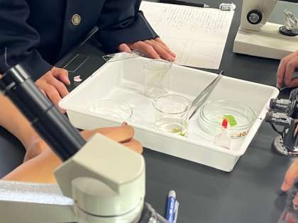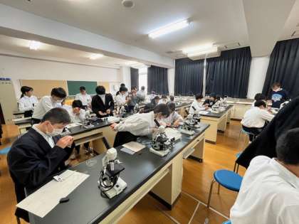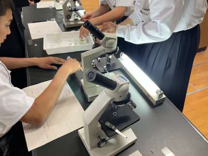 2年生「理科」の授業です。オオカナダモ、タマネギ、口腔上皮などの細胞を顕微鏡で観察しています。植物細胞と動物細胞のちがいや、染色した核などしっかり見ています。細かいところまで観察するためにスケッチをします。