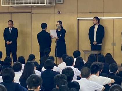 学級役員の認証式を行いました。学級のみんなの中心として責任ある行動をしましょう。次に、生徒会執行部より朝のあいさつ運動、清掃に参加してくれた生徒に感謝状の贈呈がありました。