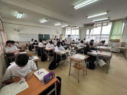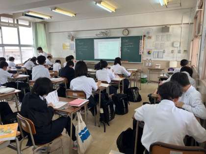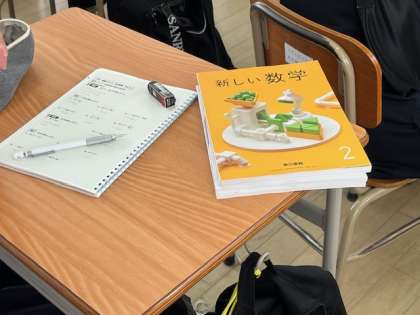 2年生「数学」の授業です。例題の説明のあと、練習問題を解いています。先生に解き方のヒントをもらったり、生徒どうし教え合ったりもしながら進めています。数学の問題の解き方を確実に自分のものにできるよう、繰り返し復習しましょう。