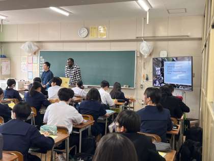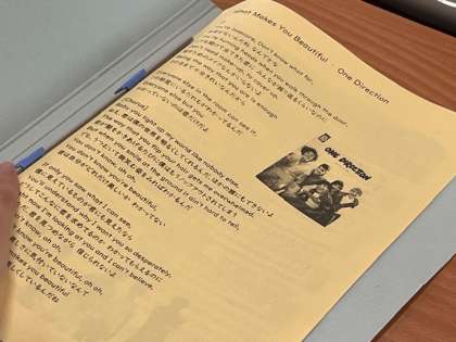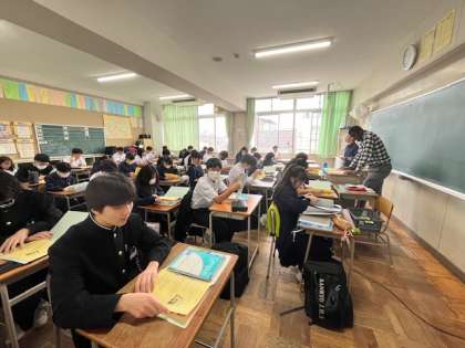 3年生、C-NETの先生とティームティーチングでの「英語」の授業です。基本的にはオールイングリッシュで行っています。英語の歌を題材に、英語に親しみながら、英語での質問に答えています。