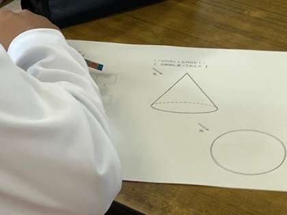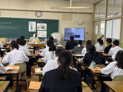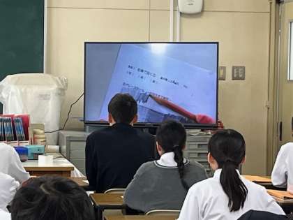 1年生「美術」の授業です。今日の授業は「鉛筆で6段階の明暗を表そう」という目標です。カメラを使って先生が描いている様子をモニターに映しています。描き方をまねながら、デッサンの基本を身につけましょう。