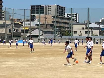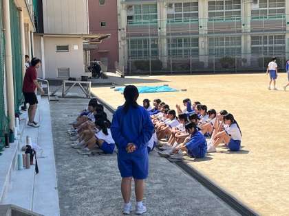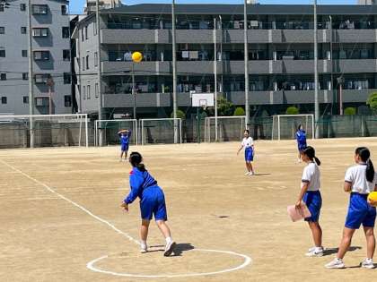 2年生「体育」の授業です。運動能力テスト「ハンドボール投げ」の測定です。練習でハンドボールの扱いに慣れることが必要です。指を広げ、親指と小指に力を入れてボールを掴むのがコツです。