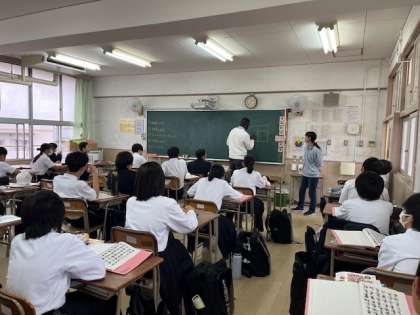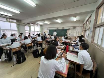 2年生「英語」の授業です。ネイティブ(C-NET)の英語の先生によるオールイングリッシュでの授業です。英語でいろいろな職業が書いてあるプリントを使っています。各職業の英語での発音を学習した後、6つのグループに分かれクイズ形式で進めています。