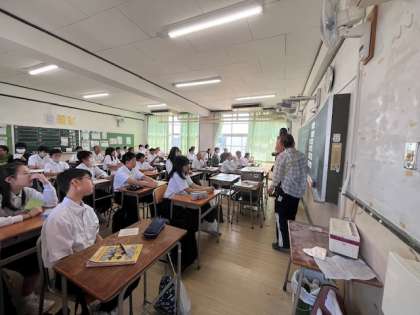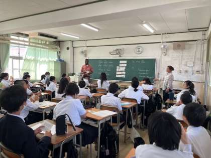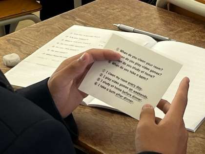 1年生「英語」の授業です。in the morning、every day、on weekendsなどの使い方を例文に沿って考えています。日常での活動の場面を思い浮かべながら、英語で答えています。