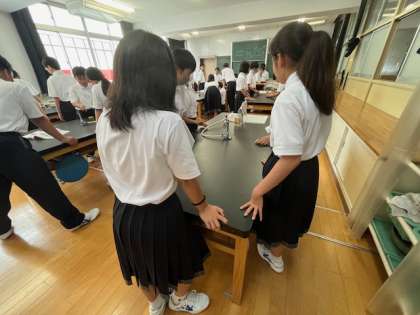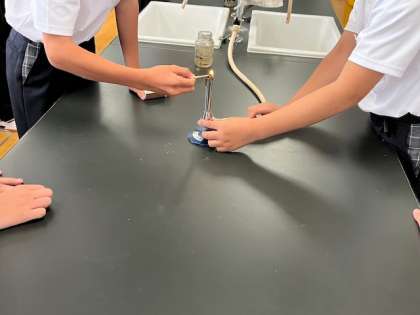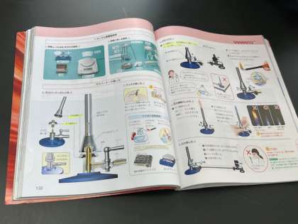 1年生「理科」の授業です。ガスバーナーの使い方を実習しています。下が「ガス調節ねじ」上が「空気調節ねじ」です。下のガス調節ねじを回すと閉まっている上の空気調節ねじもいっしょに動きます。空気調節ねじだけを回すときは、下のガス調節ねじを手で固定する必要があります。