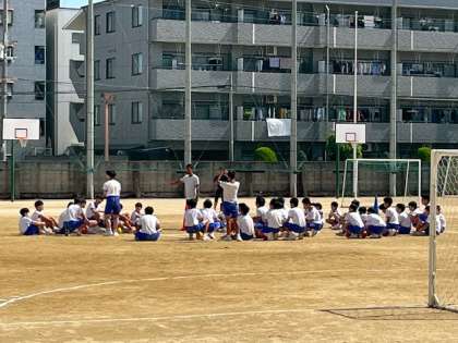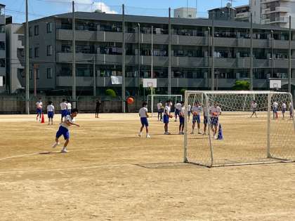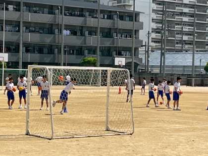 3年生男子「体育」の授業です。ハンドボールを学習しています。ハンドボールは7人1チームで相手のゴールに投げ入れて得点を競います。走る・投げる・跳ぶの3要素が揃ったスポーツです。