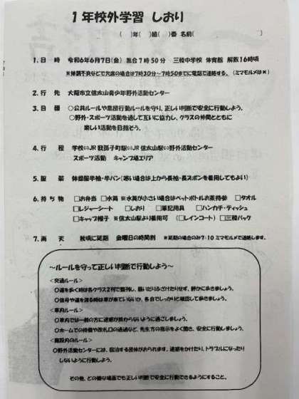 1年生は6月7日(金)は「校外学習」です。集合時刻が7時50分といつもより早くなっていますので注意してください。また、明日も暑くなりそうですので、水筒にいつもより多めに水分を入れて登校しましょう。