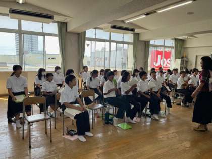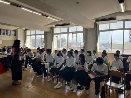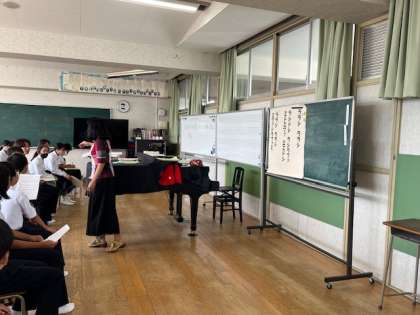 1年生「音楽」の授業です。「母音唱で声の響きの重なりを意識して歌う」ことを目標に発声から始めています。腹式呼吸で、声を響かせています。
