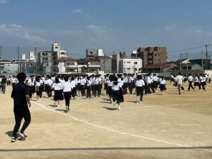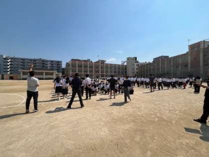 地震・津波を想定の防災訓練を行いました。地震がおきたとき、停電し放送が使えないこともあります。地震が起きた時は訓練をよく思い出し、運動場に避難→人員点呼→待機、大津波警報が出た時は3階以上建物に避難するなど覚えておきましよう。