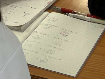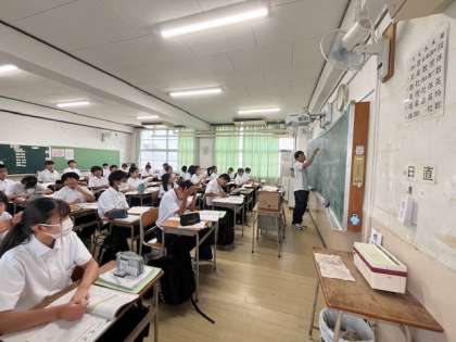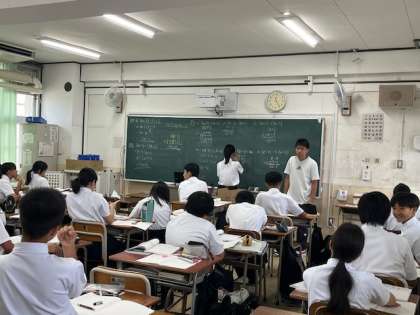 1年生「数学」の授業です。文字式の計算です。例えば、(a+7)-(5a-3)の計算を学習しています。筆算で計算したり、かっこをはずして文字どうし数字どうし計算をしたりしています。文字式に早く慣れるためには、計算のしかたを理解し繰り返し練習が必要です。
