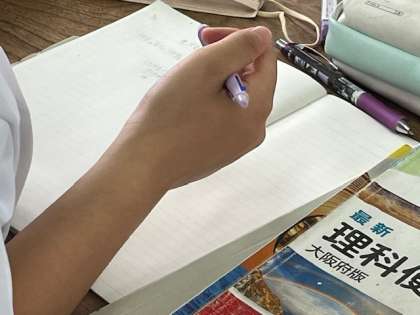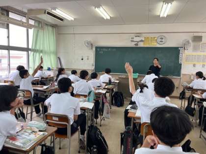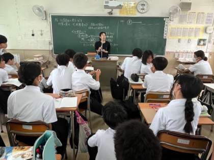 2年生「理科」の授業です。化学変化について学習しています。木の蒸し焼き、酸化銀の加熱によって別の物質ができることを確認しました。1つの物質から2つ以上の物質に分かれる変化を「分解」と言います。