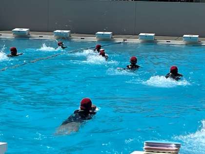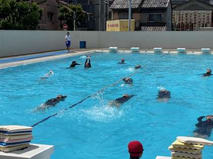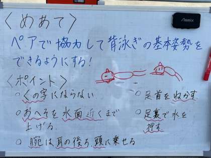 2年生「体育」水泳の授業です。「背泳ぎ」の練習です。生徒は、この時間の「めあて」「ポイント」をよく理解して練習に取り組んでいます。みんなで「がんばれ!」と声をかけあっています。