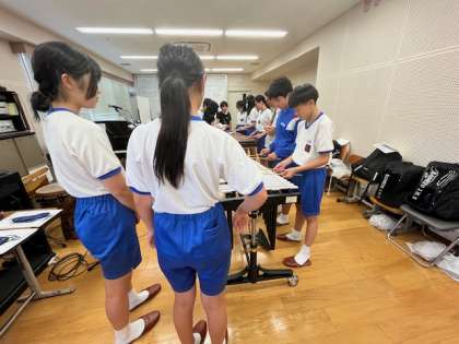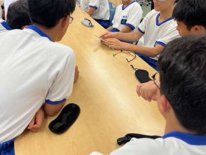 社会科、音楽科の授業です。アイマスクをして音を聞き分けたり、日本地図の模型を使って近畿地方の位置を確認したりしています。
