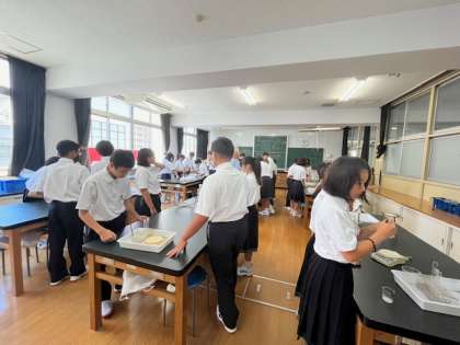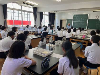 1年生「理科」の授業です。水にとけた物質を取り出す実験です。硝酸カリウム、塩化ナトリウムを水に入れ温度を上げてとかします。できた水溶液を冷やして、出てきた物質を観察します。どうなるか予想・仮説を立て結果について考察します。